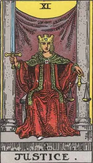 Justice is card number 11 in the RWS Tarot, signifying balance, fairness, and harmony. It represents the ethical principles that guide our actions.